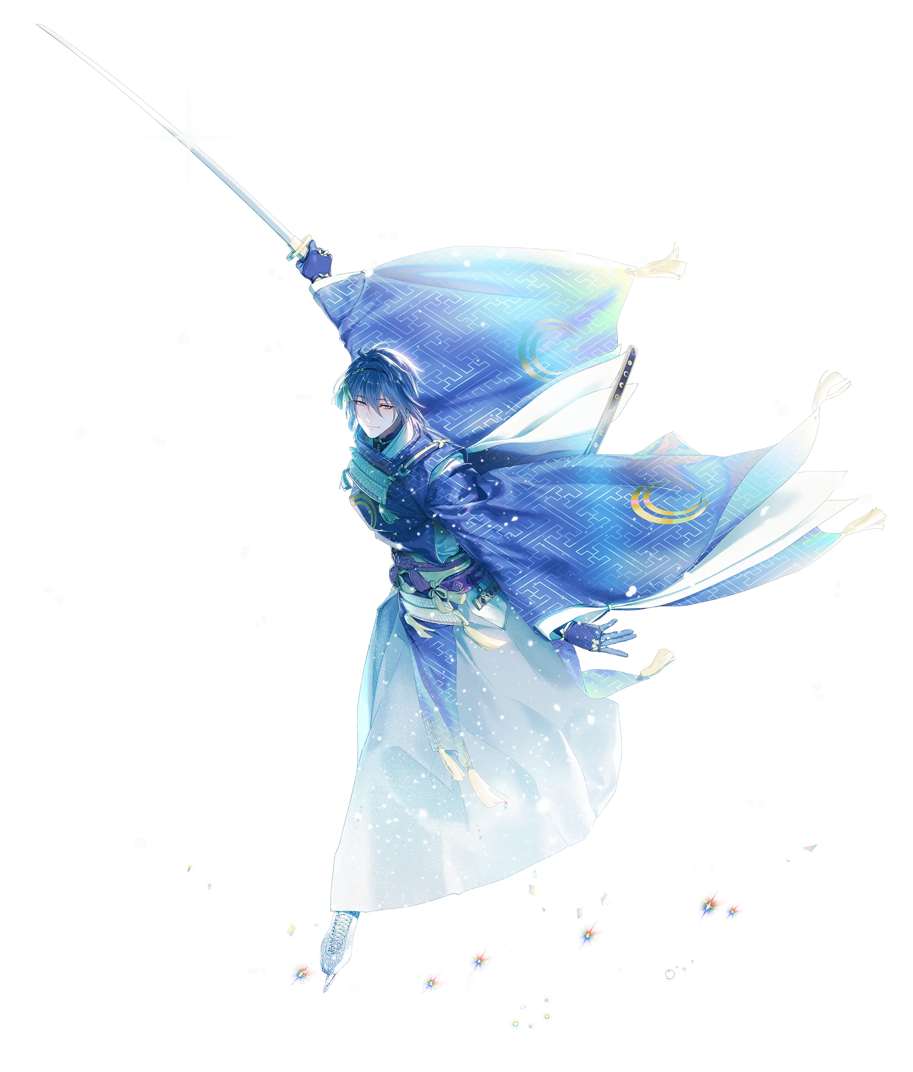 公開された『三日月宗近 イメージオンアイスver.』は、刀剣乱舞ONLINEの原作スタッフより本公演のために描き下ろされた特別な「三日月宗近」の姿です。深い青を基調とした装束に、氷の煌めきを想起させる粒子が舞い、刀剣男士としての静謐さとフィギュアスケートの躍動感が融合。高く掲げられた刀と、氷を捉えるスケート靴のエッジが、アイスショーのコンセプトである「二つの刃の共鳴」を鮮やかに表現しています。